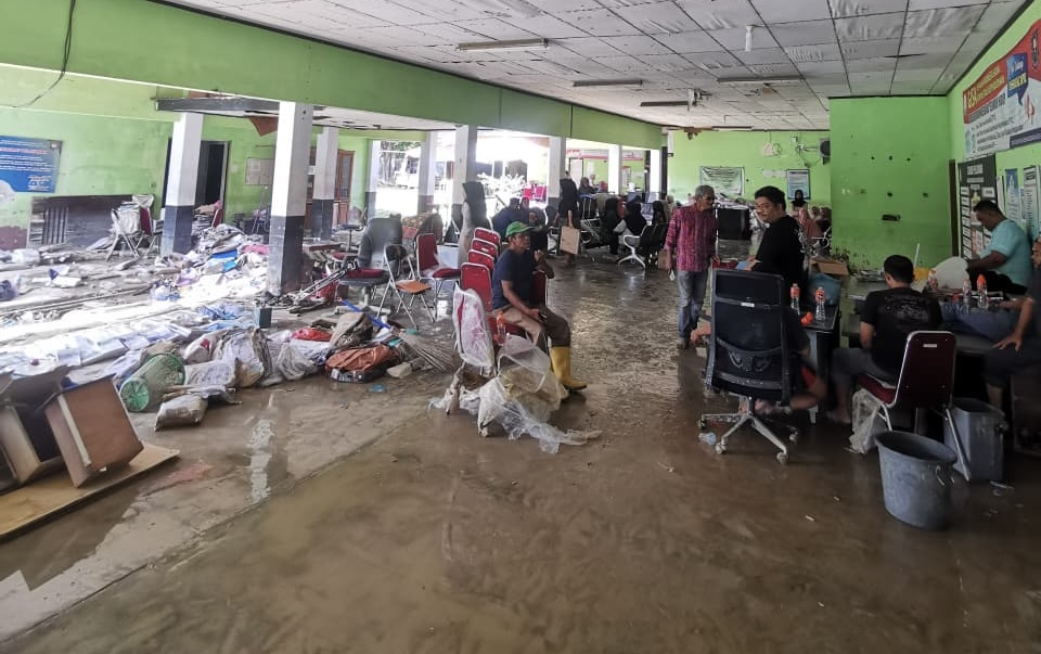 Pegawai Disdukcapil Aceh Utara membersihkan kantor pasca bencana hidrometeorologi untuk memulihkan layanan administrasi kependudukan.